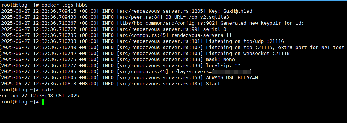 sudo docker run --privileged -v /etc/localtime:/etc/localtime:ro --name hbbr -v /root/rustdeskdata:/root -td --net=host --restart unless-stopped rustdesk/rustdesk-server hbbr查看日志,时间已经一致。