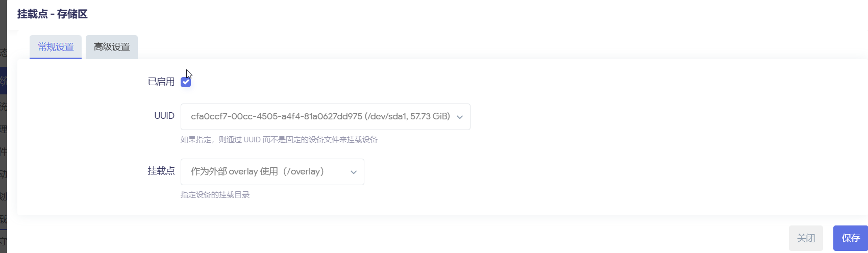 点击修改之后进入到如下界面,确保启用此挂载点是勾选状态,挂载点选择 作为外部overlay使用,保存&应用,