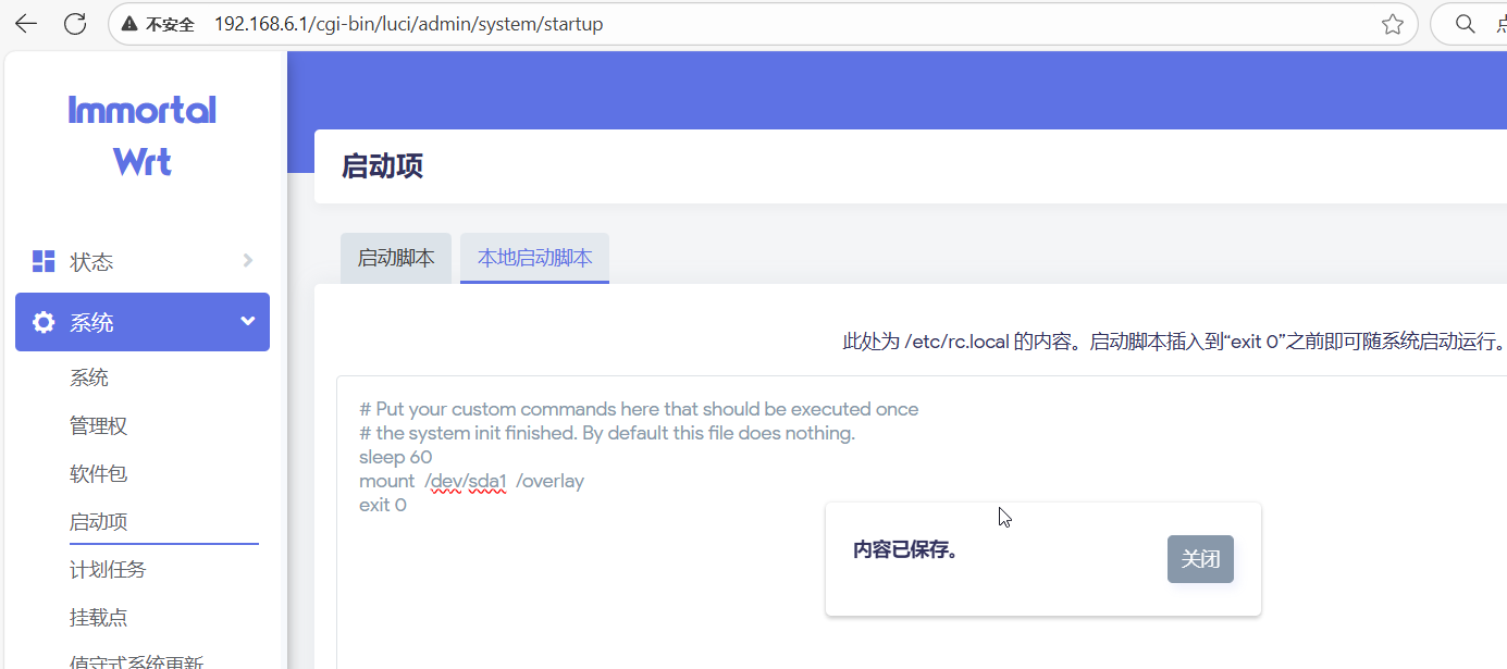 为了更进一步确保 开机自动挂载U盘成功。在本地启动脚本中写入挂载命令